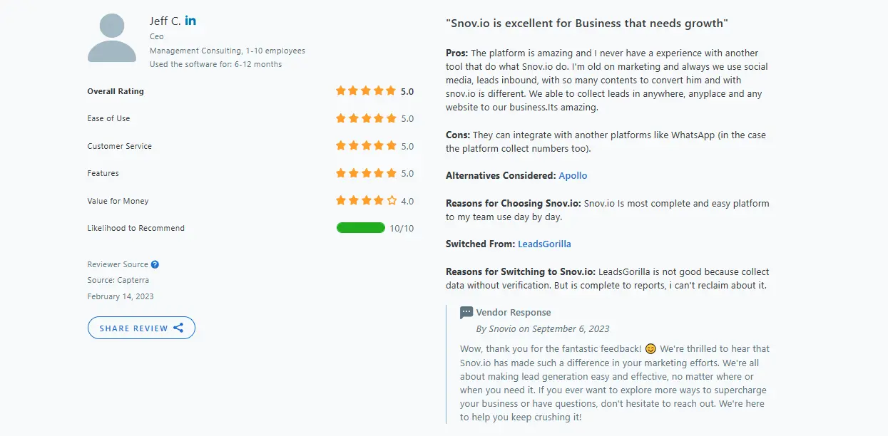Exemplary positive review about Snov.io: