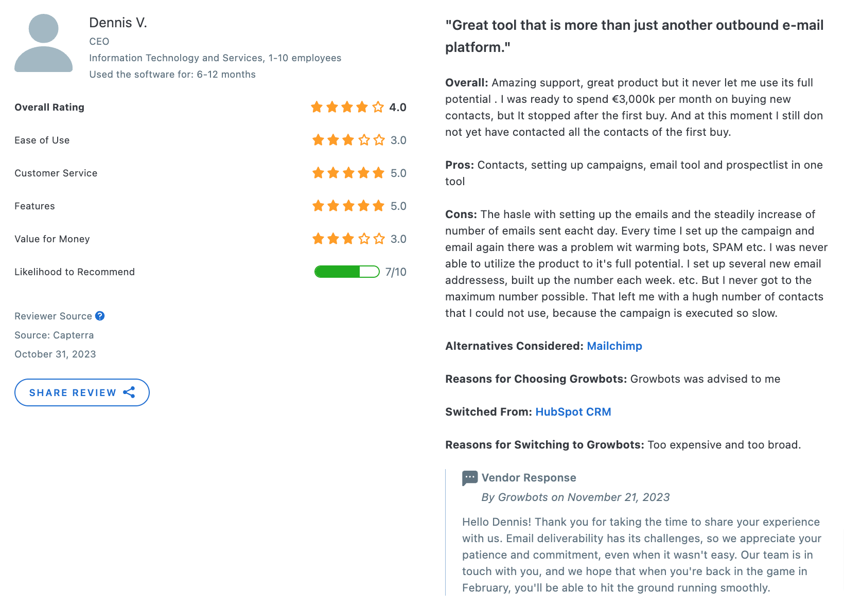 In contrast, Growbots has been gaining favor among users for its well-rounded performance, top-notch support, and overall value for money: