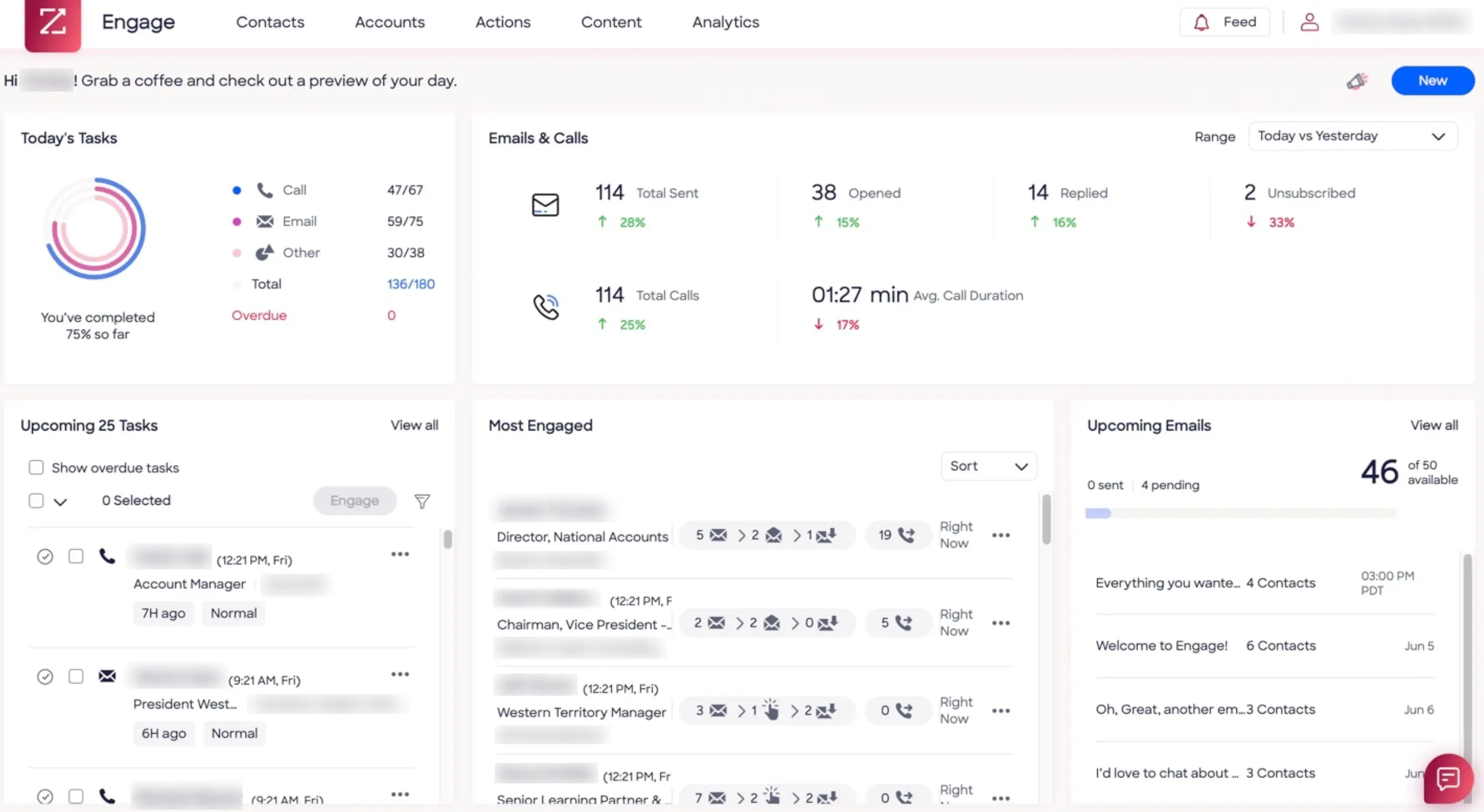In terms of email outreach, Zoominfo lets its users customize email templates using the Engage feature, automate follow-up reminders to ensure no lead is left behind, efficiently nurture leads through automated touchpoints, and shorten sales cycles by leveraging automated emails as virtual sales reps.