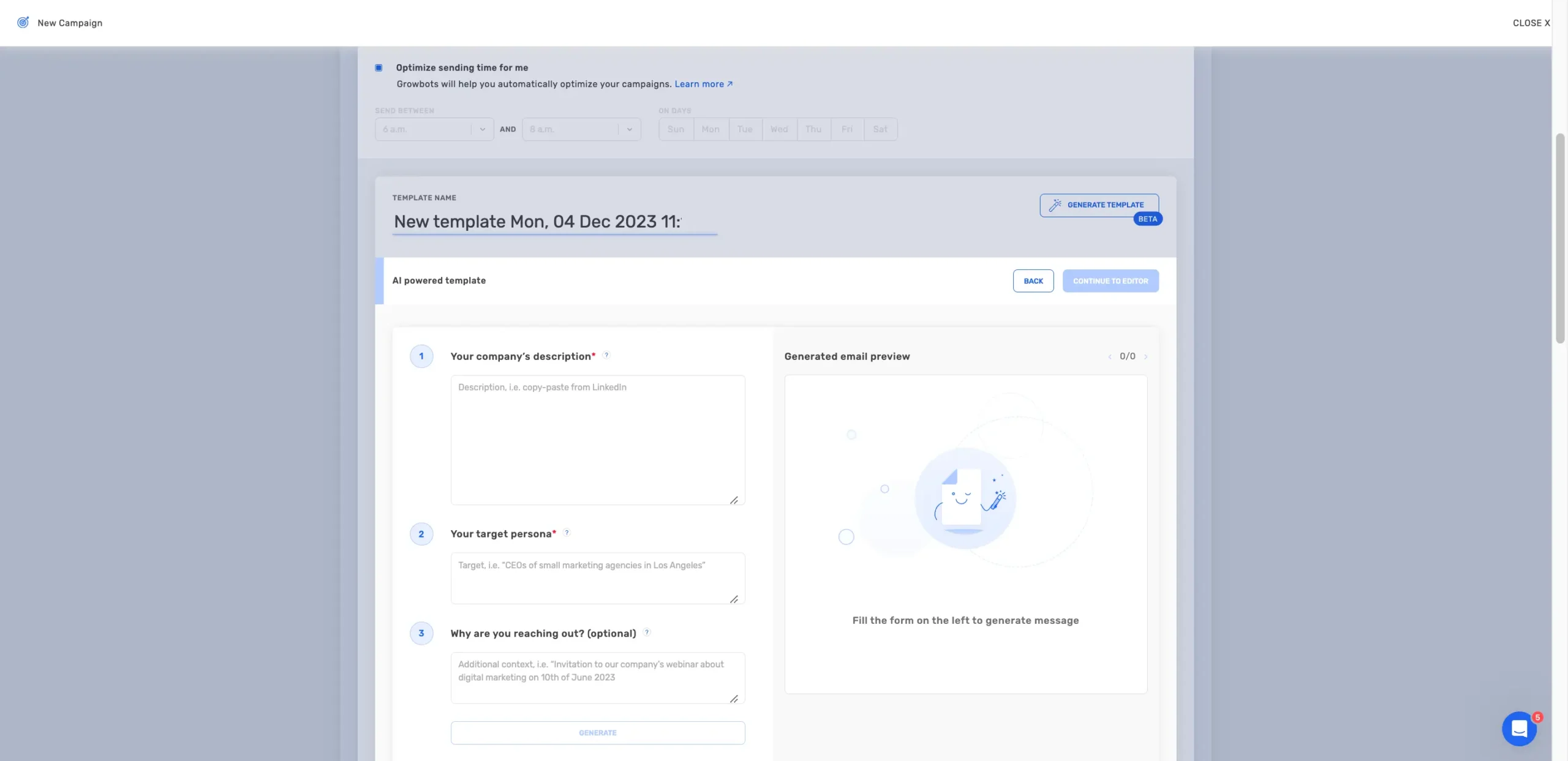 Growbots enhances email outreach with its advanced functionalities. The platform’s AI Template Generator is designed to create personalized and compelling email templates, tailored specifically to target audiences, streamlining the messaging process for businesses and minimizing time spent on content creation.