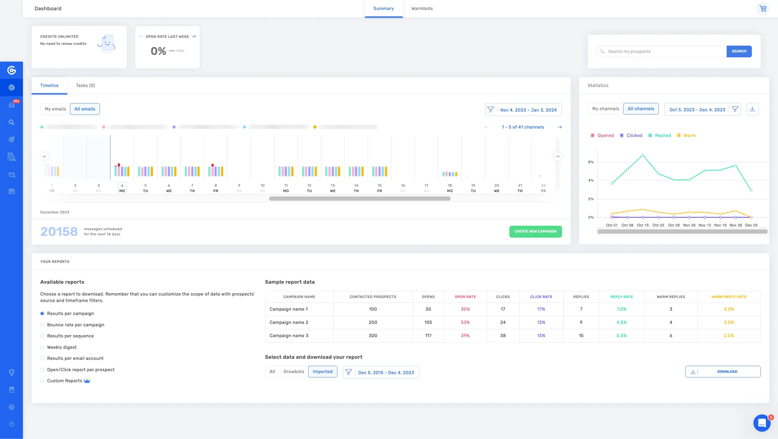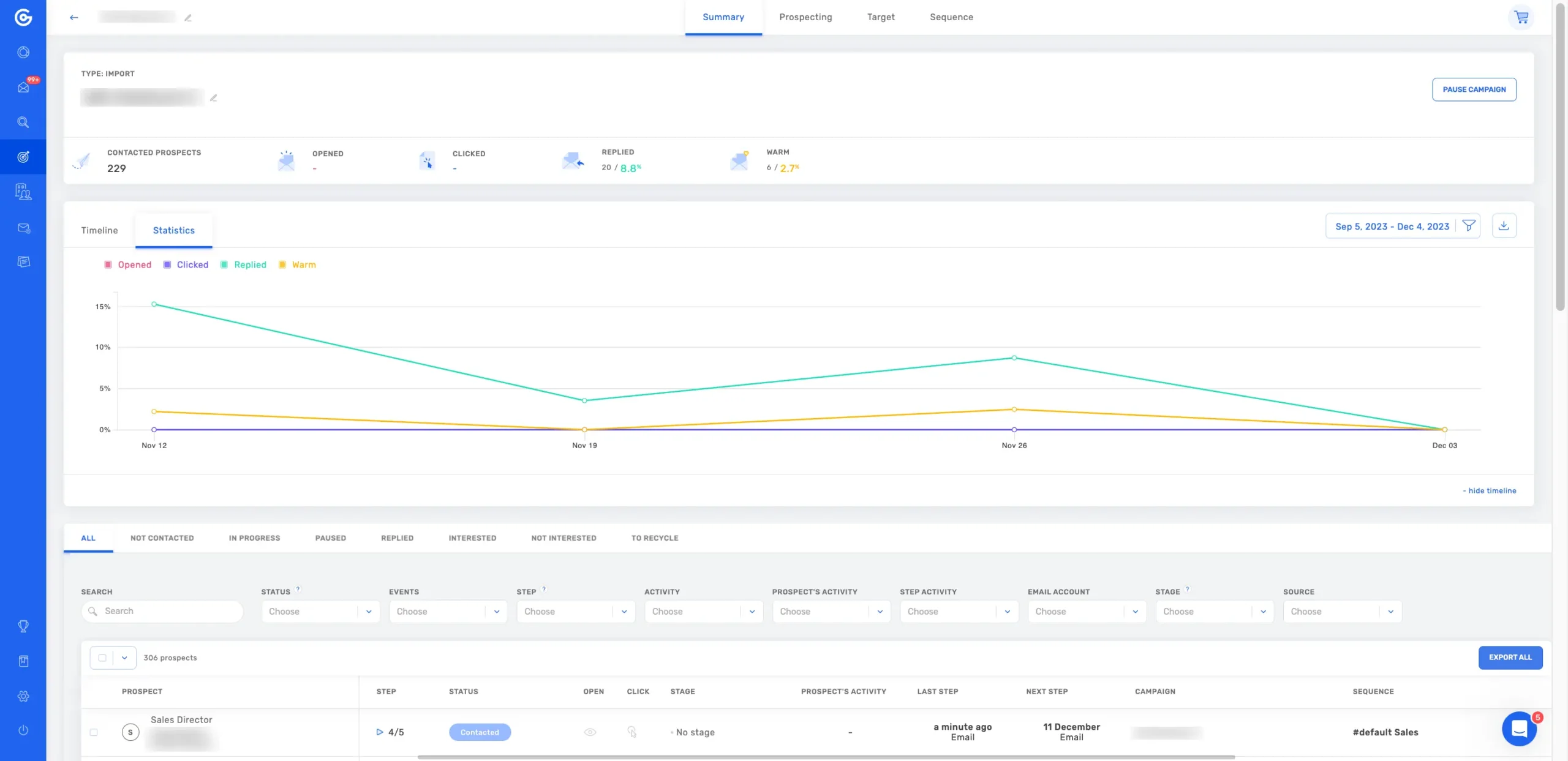 It offers detailed insights, allowing businesses to make more informed decisions than they might with other tools. Key metrics available include Sent, Opened, Clicked, Replied (excluding automatic replies), and Warm replies (marked as positive responses by Growbots’ algorithm).